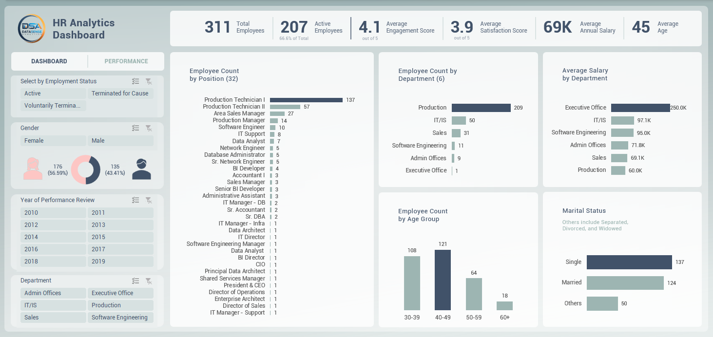 The main dashboard lets us see the company's workforce composition in more detail through charts about Employment Count by Position, Department, Age Group, and Marital Status. These charts allow us to understand the organization's scale and demographic makeup, which are crucial factors in decision-making processes.