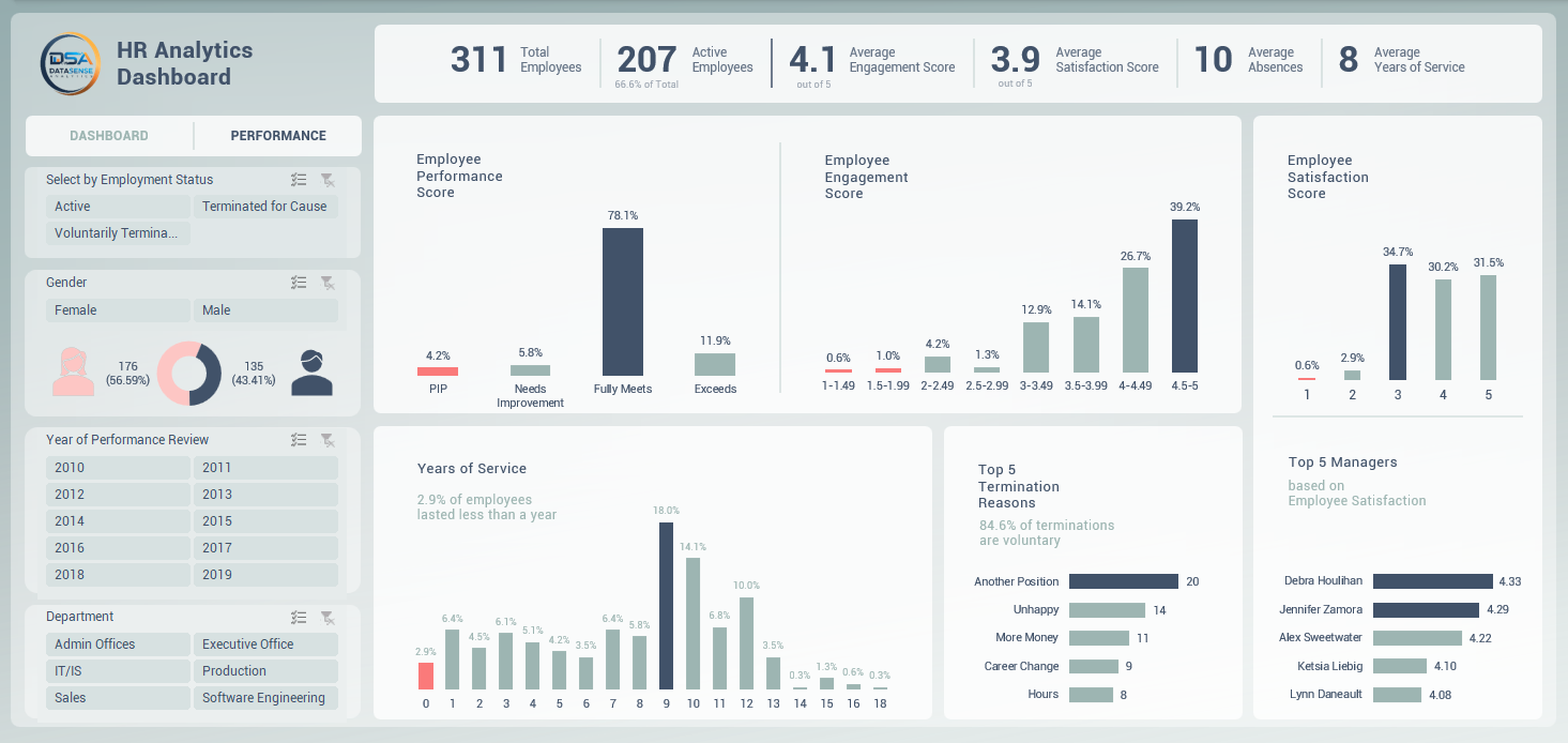 Employee satisfaction appears to be a key area of focus. Scores show a predominance of a rating of 3 with an average of 3.9, suggesting space for improvement in overall job satisfaction. In connection with this, the high voluntary turnover rate (84.6%) is critical, with reasons including seeking different positions and unhappiness. Within the dashboard, we can also identify managers whose teams have better average satisfaction levels, providing valuable insights into suitable leadership methods.